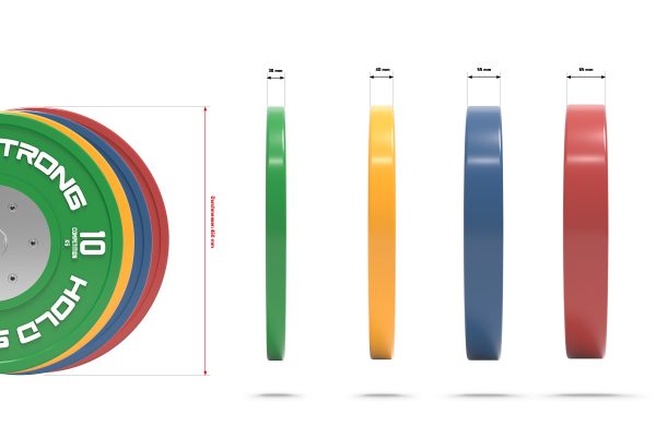 Die HOLD STRONG Competition Bumper Plates sind farbig gummiert. Sie bilden die Olympische Farbskala (10 kg = grün, 15 kg = gelb, 20 kg = blau, 25 kg = rot) ab. So kann das Gesamtgewicht der Hantel von Athleten, Kampfrichtern und Publikum schnell erfasst werden.