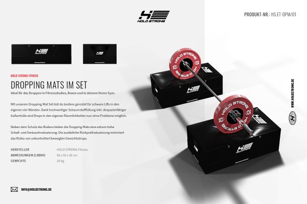 Die HOLD STRONG Dropping Mats erlauben das Droppen, das heißt Abwerfen auch schwerer Gewichte aus allen Höhen und Positionen. Die Matten sind vor allem für die Arbeit mit der Langhantel entwickelt worden und hierbei mit Bumber Plates, Competition Plates und allen anderen Formen von Gewichtsscheiben kompatibel. Sie eigenen sich für Olympic Weightlifting, Powerlifting oder Cross-Fitness gleichermaßen. Die Matten werden im 2er-Set geliefert und können beliebig positioniert werden, so dass die Länge der Langhantel keine Rolle spielt.