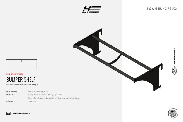 | Montage | Kompatibel mit alle ELITE Rig Systemen. Dieses Regal wird einfach auf eine Sprossenwand eingehangen (Länge 1060). |