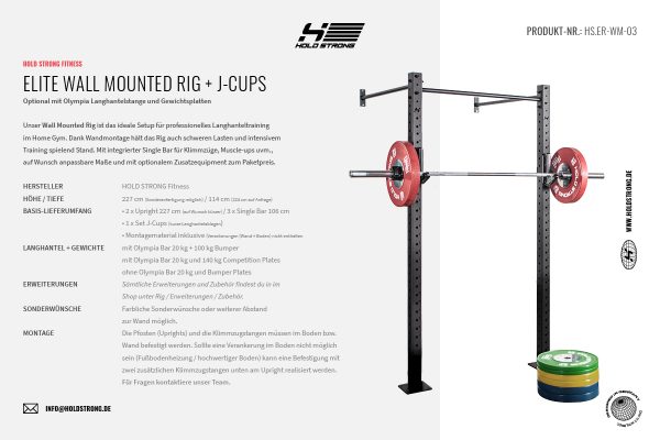 Das wandmontierte Rig wurde für das Homegym-Training mit der Langhantel konzipiert. Wer noch keine Hantel besitzt, kann unsere professionelle HOLD STRONG Olympia Bar zum günstigen Paketpreis inklusive Gewichtsscheiben dazu bestellen – es handelt sich hier um sehr qualitative Produkte die auch in Fitnessstudios verwendet werden. Zur Auswahl stehen Competition Plates in Wettkampfqualität oder unsere robusten HOLD STRONG Gummi-Bumper Plates, die sich besonders für Olympisches Gewichtheben und Cross-Training eignen und geräuscharm abgeworfen werden können.
