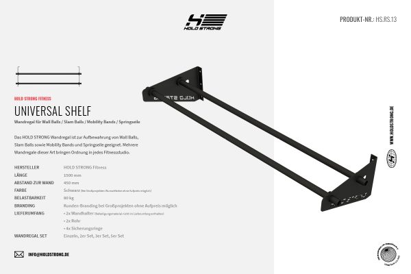 Das HOLD STRONG Wandregal ist zur Aufbewahrung von Wall Balls, Slam Balls sowie Mobility Bands und Springseile geeignet. Mehrere Wandregale dieser Art bringen Ordnung in jedes Fitnessstudio. Bei Set-Bestellung sparst du bis zu 146,00€.